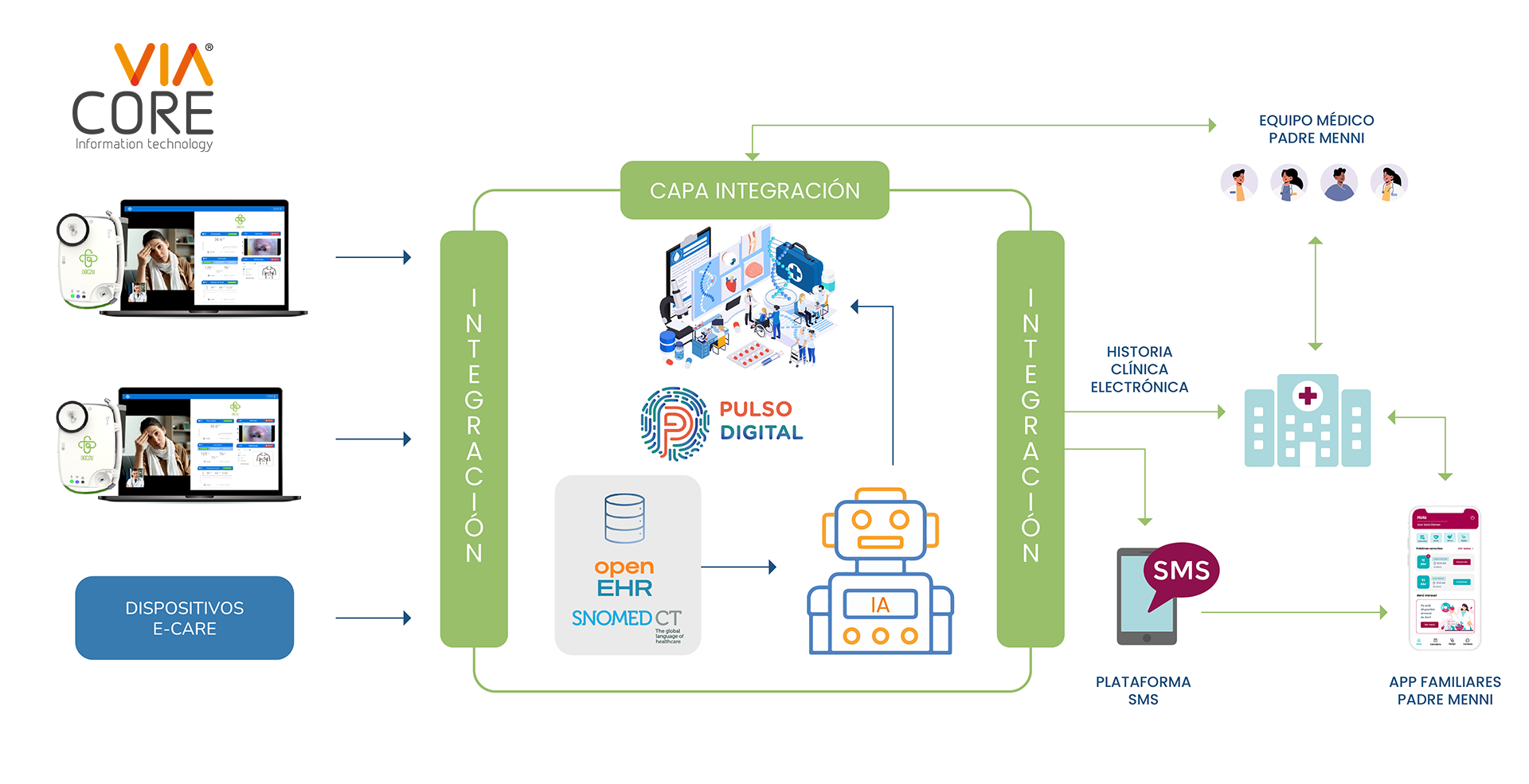 - Los datos recogidos se envían a una plataforma inteligente que analiza, genera alertas, predicciones, y se conecta con la Historia Clínica Electrónica para que el médico vea todo en un mismo lugar.