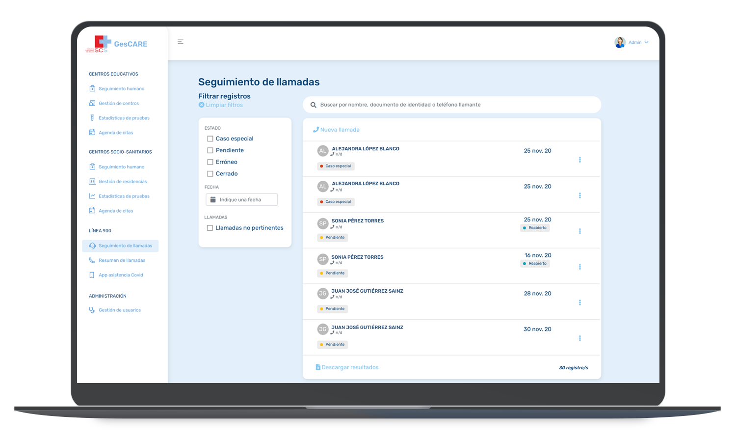 Paneles de administración para personal sanitario y gestores, con filtros, auditoría y exportación de datos.