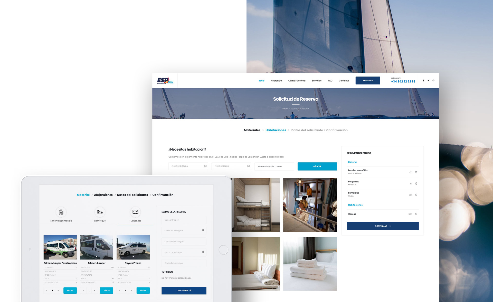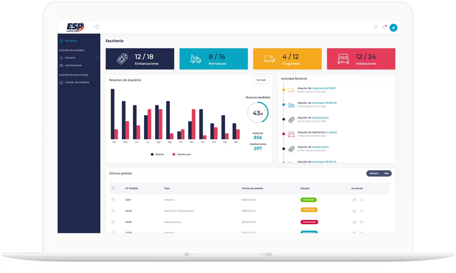 El sistema desarrollado para la Real Federación Española de Vela (RFEV), incluye un portal web público para usuarios, un panel administrativo para gestión interna y una interfaz avanzada de control de inventarios y estadísticas.